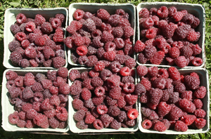 A cross between a raspberry and a blackberry; plants are a bit thorny; the fruit is large and easy to pick. It can be picked when the fruit is red or purple. It does not have a lot of eye appeal due to its dull colour. However, once tried, people keep coming back for it as it is superb for pies, jams and wine. It is the last summer berry to ripen and we only have ½ acre of this variety.