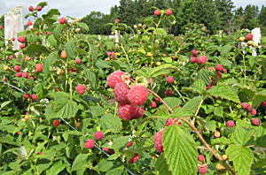 A cross between a raspberry and a blackberry; plants are a bit thorny; the fruit is large and easy to pick. It can be picked when the fruit is red or purple. It does not have a lot of eye appeal due to its dull colour. However, once tried, people keep coming back for it as it is superb for pies, jams and wine. It is the last summer berry to ripen and we only have ½ acre of this variety.